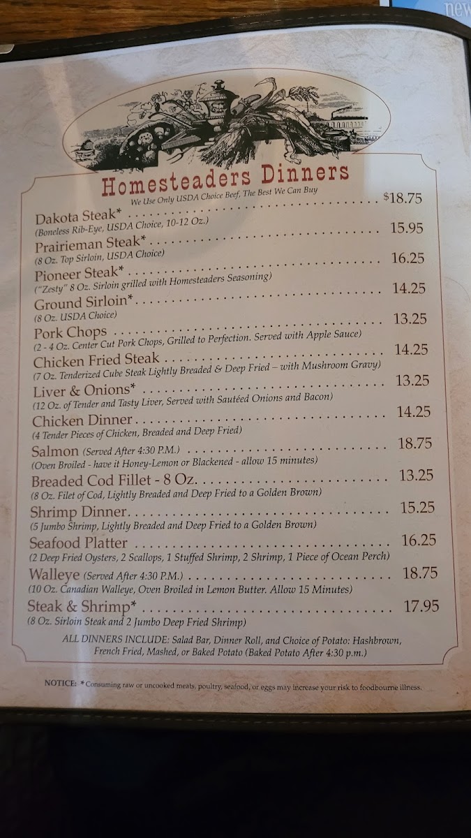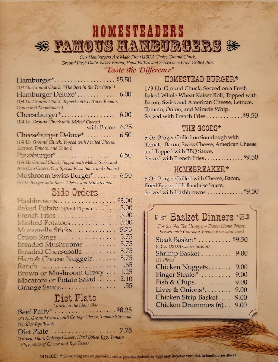 The drinks menu complements the food simply, featuring classics like regular and malted milkshakes in strawberry, vanilla, or chocolate—the kind of comforting choices that fit well with the unhurried, friendly environment. Overall, Homesteaders provides a dependable spot where you can enjoy familiar flavors in a quiet, thoughtfully decorated space, making each meal feel comfortably familiar and easygoing.