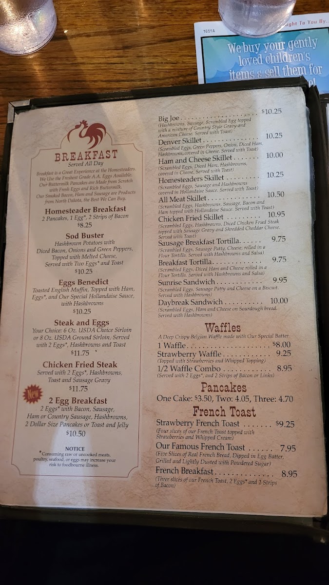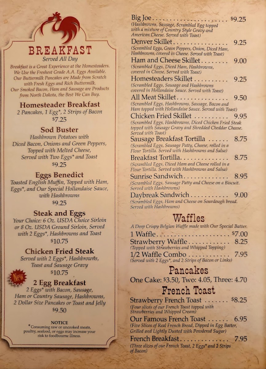 The menu at Homesteaders Restaurant offers a straightforward selection of classic American dishes, blending hearty breakfast favorites with satisfying lunch and dinner options. Whether you’re starting your day with their well-loved breakfast burrito or savoring a comforting plate of chicken fried steak later in the day, the menu reflects a warm, welcoming café style that suits a relaxed pace and friendly atmosphere.