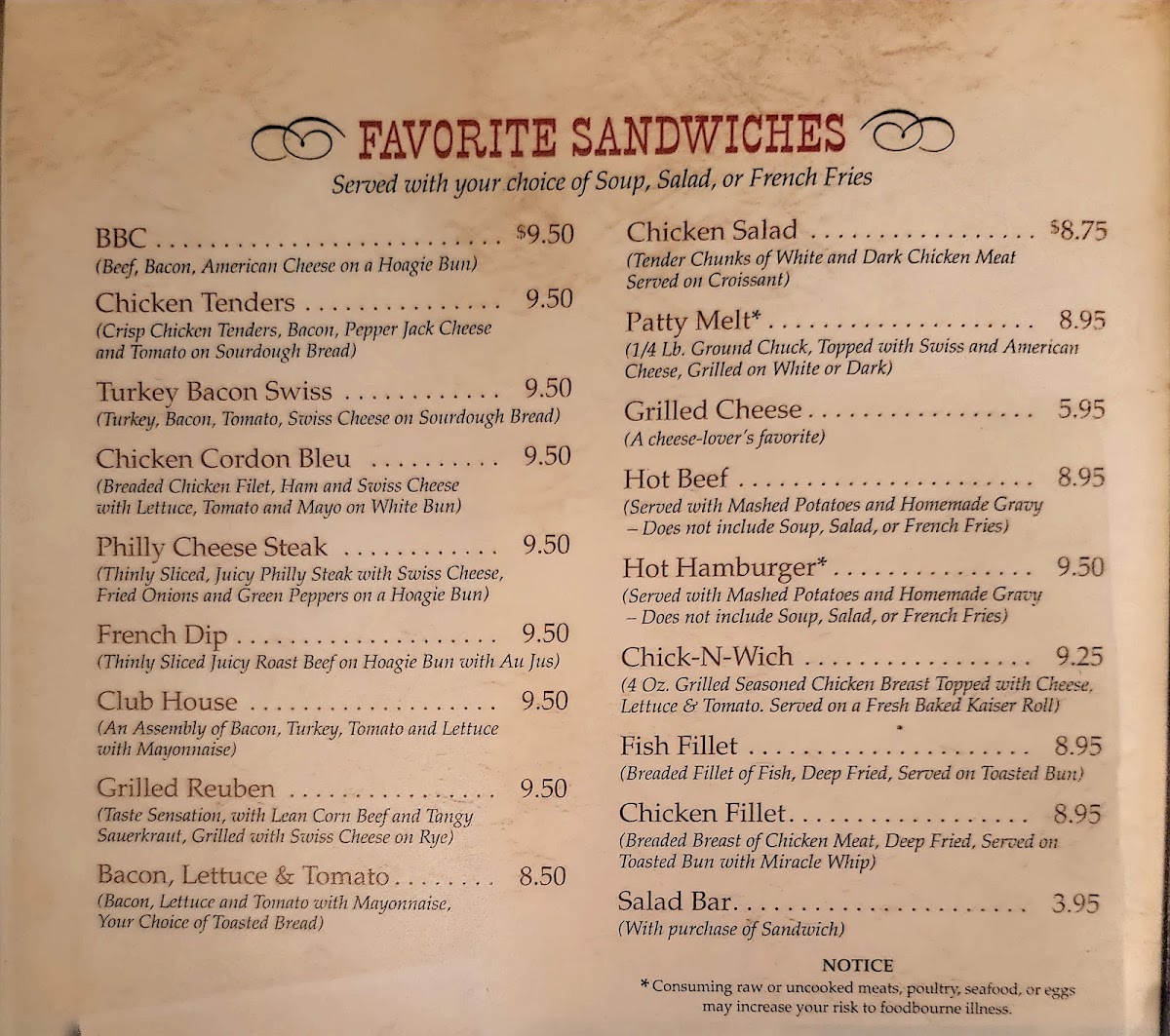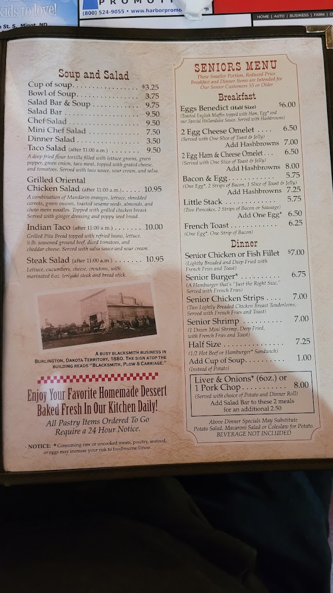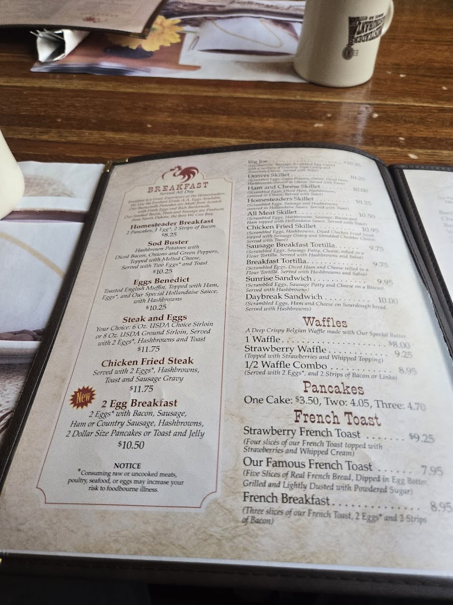 Guests will find a good balance of familiar, home-style meals alongside fresh options like the salad bar. Mornings are made brighter with orders like fluffy buttermilk pancakes, French toast, or the Homesteaders Omelette, all served in a cozy setting that invites lingering over coffee or a warm hot chocolate. For those looking for midday or evening meals, selections such as the Philly cheese steak sandwich, steak basket dinner, or roast beef dinner offer satisfying portions without the fuss.